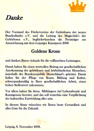 Anlässlich der „Goldenen Krone“, der Kunstpreis der Gehörlose, wurde MM