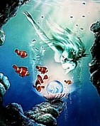 Die Frau taucht ins Wasser und entdeckt die Muschel mit der Perle. Sie denkt